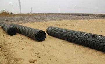 開挖基床,設(shè)置砂墊層(高差不大于10cm),碾壓成平臺,鋪設(shè)格柵,縱軸向應(yīng)與主要受力方向一致,縱向搭接15-20cm,橫向10cm,搭接處用塑料帶綁扎,并在鋪設(shè)的格柵上,每隔1.5-2m用U型釘固定于地面,鋪設(shè)的土工格柵應(yīng)及時回填土料,鋪設(shè)的土工格柵層數(shù)視技術(shù)要求。