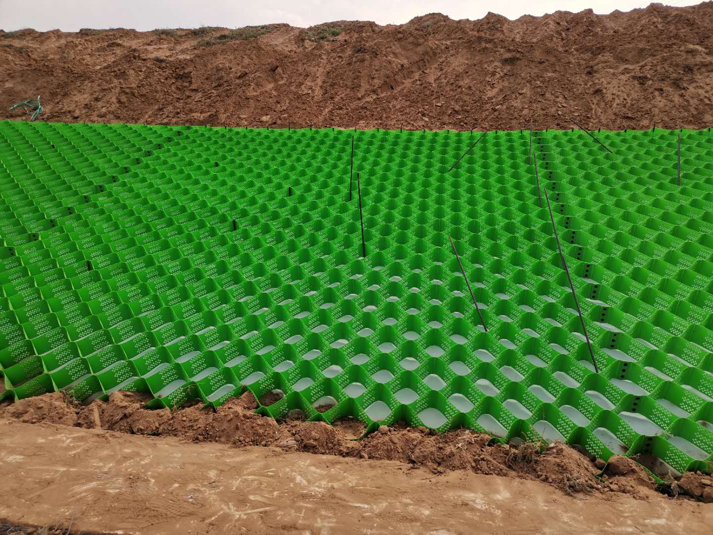 4、頂部固定后,首先把張拉后的蜂巢土工格室網(wǎng)格左右兩側(cè)的邊部固定,再將其下端的底口用錨釬暫時固定。填土后,拔掉下端固定所用的錨釬;